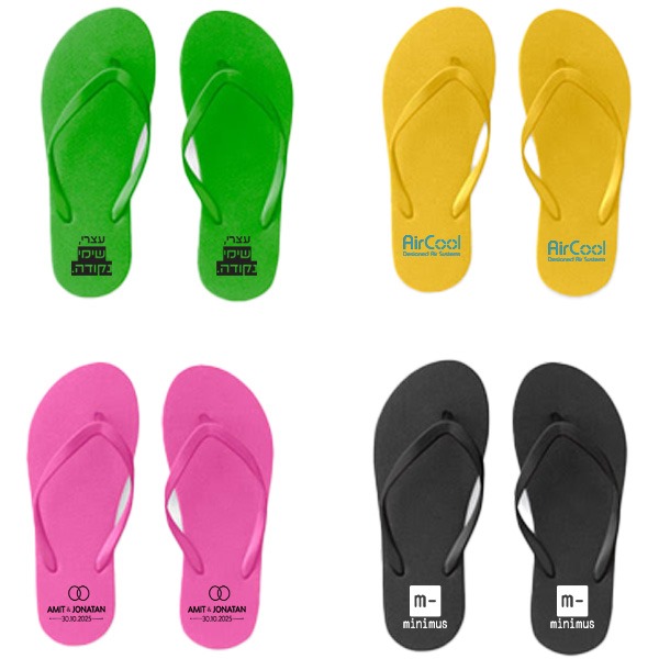 כפכפים ממותגים בצבעים שונים ובמידות שונות עם הדפסה של לוגו וכיתוב