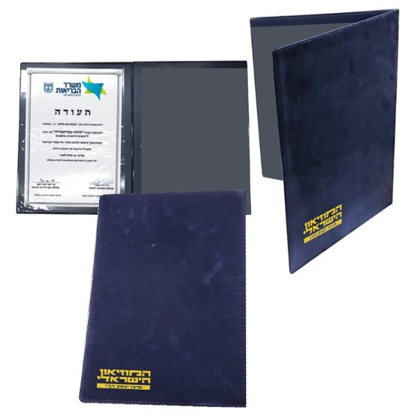 בגודל A4 מקטיפה כחולה עם מיתוג לוגו בזהב בהטבעה עם כיסים פנימיים שקופים להכנסת ניירת ניתן ליצור עם שינויים בהתאם לדרישת המזמין